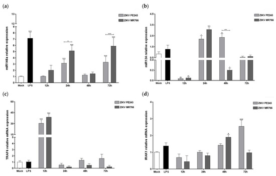 Infection of BV2 microglia cells with ZIKVPE243 or ZIKVMR766 strains differentially modulates anti-inflammatory miRNAs and inflammatory factors. BV2 cells were infected with both ZIKVPE243 or ZIKVMR766, with an MOI of 1, at 12, 24, 48, and 72 hpi using mock-treated (Mock) as a negative control and LPS + ATP (LPS) as a positive control. (a) miRNA-146a, (b) miRNA-124, (c) TRAF6 and (d) IRAK1. The mRNA expression levels were measured by RT-qPCR. ∆∆Ct plotted results were normalized to hprt1 and mock values for mRNAs, and U6 and mock for miRNAs. Statistical analysis was performed by One-Way ANOVA, considering * p < 0.05, ** p < 0.01, *** p < 0.001, as significant differences.