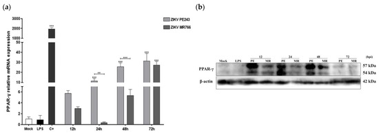 Infection of BV2 microglia cells with ZIKVPE243 or ZIKVMR766 strains differentially modulates PPAR-γ and their targets. (a) PPAR-γ mRNA copy levels were measured by RT-qPCR in BV2 infected cells by ZIKVPE243 or ZIKVMR766 with an MOI of 1 at 12, 24, 48, and 72 hpi using mock-treated (Mock) and LPS + ATP (LPS) as negative controls, and adipocyte mice cells (C+) as positive controls. (b) The PPAR-γ protein expression levels were analyzed by Western blot analysis. The membrane was stained with anti-PPAR-γ and anti-β-actin as a loading control. (c,d) IL-6 and TNF-α mRNA copy levels were measured by RT-qPCR. BV2-infected cells were evaluated at 48 hpi and treated with PPAR-γ agonist-Rosiglitazone. As negative controls were used, mock-treated with agonist (M+Rosi) and mock-treated without agonist (-Rosi), the positive control was mock-treated with LPS. Data are represented as mean ± SD of three independent experiments. Statistical analysis was performed by One-Way ANOVA, considering * p < 0.05, ** p < 0.01, and *** p < 0.001 as significant differences.