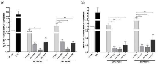 Virus sensing also triggers the expression of microRNAs (miRNAs), which can target transcripts involved in different TLR signaling pathways. Modulation of miRNA expression is an important regulatory mechanism for the timely and appropriate control of the pro-inflammatory response [31,32]. Although significant progress has been made in understanding the molecular interaction between flaviviruses and the host cell, the molecular role of the host immune cell’s miRNAs in the innate immune response and viral immune evasion during ZIKV infection remains incompletely understood [33,34].