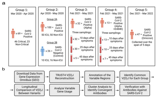 Overview of sample population and experimental design. (a) RNA-seq data from the same patient were combined in each group. All data were downloaded from the GEO databases (Group 1: GSE172114; Group 2: GSE157103; Groups 3 and 4: GSE190680; and Group 5: GSE201530). SARS-CoV-2 variants in Groups 1 and 2 were not identified. (b) The workflow of the longitudinal analysis of reconstructed V(D)Js. Figures were created with the web-based application BioRender, (https://app.biorender.com, accessed on 12 October 2022).