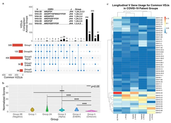 In order to determine if the common VDJ sequences found within each group were present as common VDJ sequences in other groups, we conducted a longitudinal comparison. Each common VDJ sequence was cross-checked to other groups to see if it occurred as an Inter-Group Common VDJ (IGC-VDJs). Most were found as a common VDJs only within their own group (Figure 2a, black bars); however, 95 were IGC-VDJs (Figure 2a, blue circles connected by lines), with the number of IGC-VDJs having that pattern of appearance indicated (Figure 2a, black bars). One such IGC-VDJ (IGHV4-59, IGJH4 and CDR3 sequence ARGFDY) was observed in all five sample groups (Figure 2a). Five other VDJ sequences were found in four out of the five groups. When comparing Group 3 (infected by Alpha variant) to Group 5 (infected by Omicron variant), we found 13 common VDJs that existed in both groups, making up 2.7% of the common VDJ sequences in the two groups.