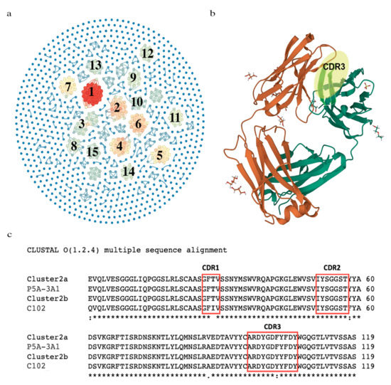 The identification of convergent VDJ clusters and comparison of the variable regions between the convergent cluster and the antibodies responsive to SARS-CoV-2. (a) Network visualization of convergent clusters. Related clusters are connected by blue lines and colored based on the number of nodes in each cluster. (b) A crystal structure of an anti-SARS-CoV-2 human neutralizing antibody Fab fragment (C102). The heavy-chain CDR3 region is highlighted in yellow. (c) VDJ amino acid sequence comparison among two members of the convergent Cluster 5, C102 (PDB code: 7K8N_A) and P5A-3A1 (PDB code: 7D0C_G) from an antibody recognizing SARS-CoV-2 in the Protein Data Bank (PDB). Notation Key: (*) indicates the conserved residue, (:) indicates conservation between amino acid groups of strongly similar properties, (.) indicates conservation between amino acid groups of weakly similar properties; as defined by Cluster O application.