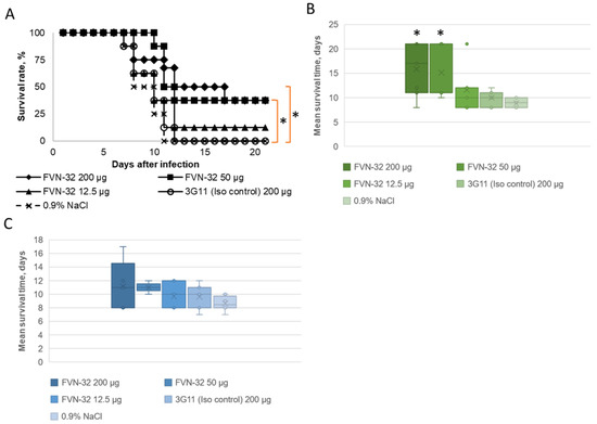 Efficacy of mAb FVN-32 in post-exposure prophylaxis. BALB/c mice (10 g) were treated i.v. with mAb FVN-32 or IgG1 mAb 3G11 at the indicated doses 24 h after injection of 5 RLD50 of TBEV, strain Sofjin. (A) Survival curves per treatment group (Kaplan–Meier curve). (B) Survival rates. (C) Mean survival time of mice excluding survivors. Results given are MST ± SEM, * p < 0.01 (log-rank test).