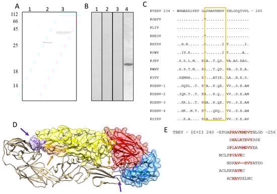 Epitope mapping of mAb FVN-32. (A) Western blot analysis of lysates of E. coli cells expressing rED3_301 (line 1), rED1+2 (line 2), and rE (line 3), which were fractionated by SDS-PAGE (12.5%) and revealed using mAb FVN-32. (B) Western blot analysis of lysates of E. coli cells expressing rED2delA (line 1), rED2delB (line 2), rED2delC (line 3), and rED2delD (line 4), which were fractionated and revealed as above. Protein mass markers in kilodaltons are represented at the left sides of a gel. (C) Alignment of the identified fragment (aa 240–260) in domain II of orthoflavivirus protein E. Abbreviations: OHFV—omsk hemorrhagic fever virus, LIV—looping ill virus, NEGV—Negishi virus, LGTV—Langat virus, PWV—Powassan virus, KFDV—Kyasanur forest disease virus, JEV—Japanese encephalitic virus, WNW—West Nile virus, YFV—Yellow fever virus, DENV-1—dengue virus serotypes 1, DENV-2—dengue virus serotypes 2, DENV-3—dengue virus serotypes 3, and DENV-4—dengue virus serotypes 4, ZIKV—Zika virus. (D) Ribbon representation of TBEV E protein 3D structure (PDB 1SVB) with specified region 247–254 aa (orange arrow) and the fusion loop (purple arrow). The molecular coordinates for the structural analysis were derived from the Protein Data Bank and rendered using UCSF Chimera molecular visualizer, version 1.15 [26]. (E) Alignment of region 240–256 aa of TBEV glycoprotein E and peptides recognized by mAb FVN-32 selected from phage libraries.
