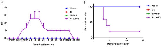 Observation records showed that chickens in the HLJ0504 group showed increasingly obvious clinical symptoms at 48 h p.i., mainly including mental depression, decreased appetite, preference for lying down, decreased response to external stimuli, and some chickens excreting loose white stools. Death started to appear in the experimental animals from 3 d p.i., followed by a gradual improvement in the conditions of the chickens that developed tolerance. The MSI curve also showed similar characteristics, with the MSI reaching its highest value at 3–5 d p.i. and then gradually decreasing (Figure 1a). In the chickens dedicated to the analysis of the mortality of the HLJ0504 group, two, one, and one chickens died at 3 d p.i., 4 d p.i., and 5 d p.i., respectively, with a final fatality rate of 80% (4/5) (Figure 1b). Similar to the mock group, neither the SHG19 nor the Gt group had appearance signs or death (MSI = 0).