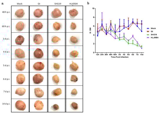 For the HLJ0504 group, the bursa did not show lesions on appearance from 12 h p.i. to 24 h p.i. At 36 h p.i., 40% (2/5) of the bursas had the appearance indicating caseous necrosis, and at 48 h p.i., 40% (2/5) of the bursas were pale, atrophic, and produced inflammatory mucus. From 60 h p.i. to 14 d p.i., all dissected chickens had a bursa with pale or earthy yellow, atrophic appearance, and exudation of inflammatory mucus. For the SHG19 group, the first visible lesion in bursa was observed at 48 h p.i., with 20% (1/5) of the bursas being pale and exuding inflammatory mucus. At 60 h p.i., 60% (3/5) of the bursas appeared grayish or earthy yellow and exuded inflammatory mucus, and one of the chickens had an atrophied bursa. From 72 h p.i. to 14 d p.i., all dissected chickens had pathological changes in their bursas including atrophy. For the Gt and Mock groups, the appearance, color, and size of the bursa remained normal throughout the test period (Figure 2a).
