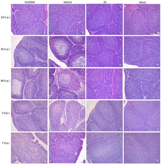 Compared to the Mock group, typical histopathological changes were observed in the bursa in the HLJ0504 and SHG19 groups, while no pathological changes were found in the Gt group (Figure 3). For the HLJ0504 group, at 36 h p.i., the bursa with gross lesions showed partial follicular atrophy with a significantly decreased number of medullary lymphocytes. At 48 h p.i., in addition to follicular atrophy and a large reduction in lymphocytes due to necrosis, a locally vacuolated medulla with protein-like exudation was observed. After 60 h p.i., a significant infiltration of heterophils and interstitial hyperplasia was observed. Histopathological damage to the bursa remained severe even at 14 d p.i. For the SHG19 group, histopathological changes in the bursa also appeared at 36 h p.i. at the earliest with a remarkable reduction in medulla lymphocytes in some follicles. From 48 h p.i. until 14 d p.i., follicular atrophy progressively deteriorated, with a decrease in excessive necrosis of lymphocytes, notable heterophil infiltration, and interstitial hyperplasia.