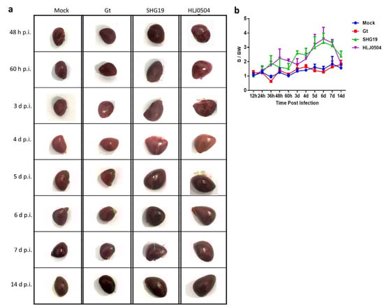 Gross lesions of the spleen. (a) The appearance of the spleen in each group from 48 h p.i–14 d p.i. (b) Spleen-to-body weight ratio (S/BW). The S/BW ratios for each group at each time point were averaged over 5 chickens, except for the HLJ0504 group at 5 d p.i. to 7 d p.i. (n = 3) and 14 d p.i. (n = 1).