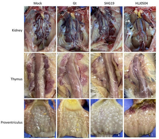 Gross lesions of the kidney (a–d), thymus (e–h), and proventriculus (i–l) of group HLJ0504, SHG19, Gt, and Mock. Pathological changes such as piebald in the kidney, thymus atrophy, and proventriculus hemorrhage were marked with arrows.