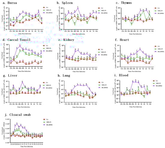 In vivo distribution and load of IBDV. (a) Bursa. (b) Spleen. (c) Thymus. (d) Caecal tonsil. (e) Kidney. (f) Heart. (g) Liver. (h) lung. (i) Blood. (j) Cloacal swab. The values for each group at each time point were averaged over three chickens, except for the HLJ0504 group at 14 d p.i. (n = 1). Treatments sharing different lowercase letter differ significantly at a confidence level (p < 0.05).