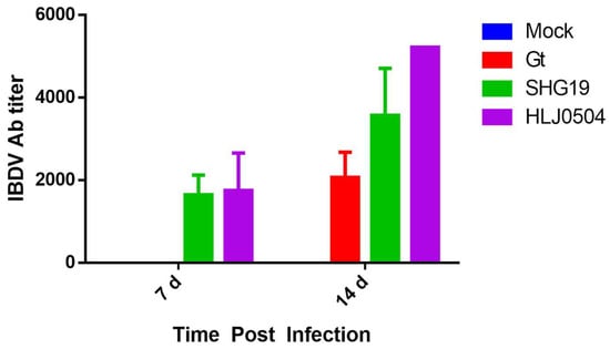 At 7 d p.i., IBDV antibodies were detected in sera of samples from the HLJ0504 and SHG19 groups with ELISA, and the concentrations of antibodies were significantly higher at 14 d p.i. In the Gt group, antibodies were not detected at 7 d p.i. but turned positive at 14 d p.i. At 14 d p.i., the highest mean antibody level was found in the HLJ0504 group, 1.5- and 2.5-fold higher than in the SHG19 and Gt groups, respectively (Figure 8).