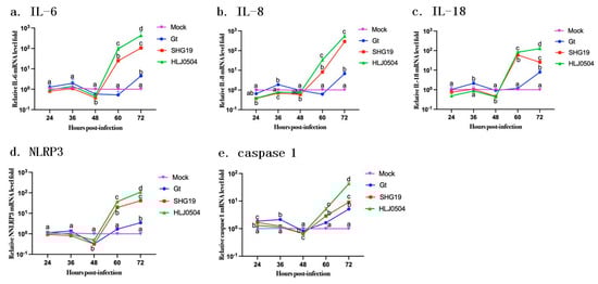 Inflammation-related genes expression in DT40 cells infected with different IBDV strains. The mRNA levels of IL-6 (a), IL-8 (b), IL-18 (c), NLRP3 (d), and caspase 1 (e) at 24, 36, 48, 60, and 72 h post-infection were detected by qRT-PCR. Treatments sharing different lowercase letter differ significantly at a confidence level (p < 0.05).