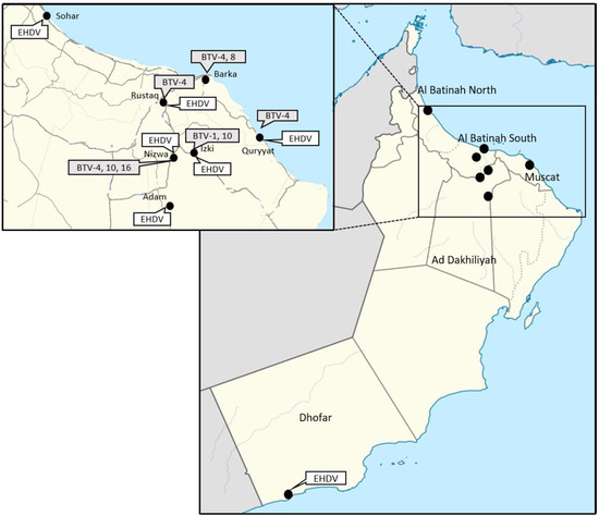 In this study, serological results on bovine samples show that 74% of the animals are seropositive against BTV and 53.1% against EHDV, suggesting a significant circulation of these two viruses in the south-eastern Arabian Peninsula. In comparison, BTV ELISA results obtained on small ruminants seem to show a lower seroprevalence (50% and 30.4% of positive results for goat and sheep, respectively). This result, to be taken with caution because few small ruminants were tested in this study, seems, however, to illustrate that cattle are better sentinels for BTV and EHDV circulation. BTV surveillance can be focused on cattle as their larger body size results in a greater range of attraction to Culicoides than small ruminants and are therefore more likely to be involved in virus transmission [26,27]. The low seroprevalence rates of EHDV reported in small ruminants in previous studies, compared to those observed in cattle, explain why small ruminant samples were not tested in our study for either EHDV antibodies or genomes [28].