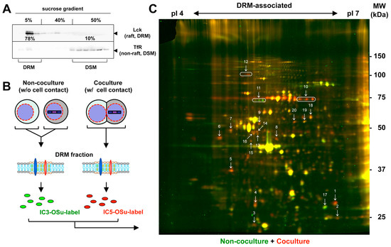 The preparation of the DRM fractions from the Jurkat cells was described previously [22]. Briefly, the Jurkat cells (1 - 2 × 108 cells) were lysed in 2.5 mL of MNE buffer (25 mM MES, 150 mM NaCl, 5 mM EDTA, 5 mM NaF, 1 mM sodium orthovanadate, and 1 mM PMSF, with pH 6.5) containing 0.2% Triton X-100 for 10 min on ice. They were homogenized with ten strokes in a Dounce homogenizer. The lysate was mixed with an equal volume of 80% (w/v) sucrose in MNE buffer and placed at the bottom of a Beckman SW41 ultracentrifuge tube. The sample was overlaid with 5 mL of 30% (w/v) sucrose in MNE buffer and 2 mL of 5% (w/v) sucrose in MNE buffer. The 40%–30%–5% sucrose step gradients were centrifuged at 125,000× g for 16 h at 4 °C in a Beckman SW41 rotor. The gradients were fractionated from top to bottom and analyzed using Western blotting. The DRM fractions were pooled, diluted with MNE buffer, and pelleted using ultracentrifugation at 125,000× g for 1 h. The DRM proteins were purified from the pellets with a 2D Clean-Up Kit (GE Healthcare, Chicago, IL, USA).