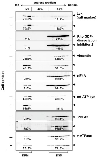 To confirm these findings, the cocultured/non-cocultured cell samples were treated with cold Triton X-100 in parallel and subjected to a membrane flotation analysis, followed by Western blotting (Figure 3 and Figure S3). We initially observed the distribution of Lck and found that, in both cell coculture/non-coculture samples, the majority of the Lck was distributed in the DRM fractions and its levels were very similar (72 ± 8% vs. 70 ± 5%), indicating that the total Lck levels associated with the DRM were largely unchanged in the cell contact condition. In contrast, vimentin was enriched in the DSM fractions in the non-cocultured sample (61 ± 6%) and in the DRM fractions in the cocultured sample (45 ± 7%), indicating that vimentin was incorporated into the DRM upon cell contact. eIF4A, PDI A3, and v-ATPase were originally enriched in the DSM fractions, and only small populations were distributed in the DRM (2 ± 1%, 2 ± 1%, and 6 ± 3%, respectively) under the non-cocultured conditions. However, their distributions in the DRM increased slightly upon cell contact (9 ± 3%, 7 ± 2%, and 25 ± 3%, respectively). The majority of mt-ATP synthase was associated with the DRM (65 ± 8%), but further incorporated into the DRM upon cell contact (98 ± 1%). These results were consistent with the data obtained via the 2D DIGE analysis. A literature search revealed that several of the molecules identified by our 2D DIGE analysis had been suggested to be involved in HIV-1 infection by previous studies (see below). The Rho GDP-dissociation inhibitor 2 was exclusively enriched in the DSM fractions of both cell samples (>99%), indicating that its incorporation into the DRM is essentially rare.