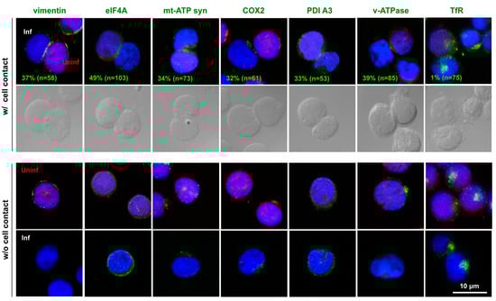 We explored whether the molecules that displayed increased incorporations into the DRM upon cell contact were indeed accumulated at the cell–cell contact sites. The HIV-1-infected Jurkat cells were cocultured with CMTMR-prelabeled Jurkat cells for 1 h. The cocultured cell samples were immunostained and subjected to confocal microscopy (Figure 4). The confocal microscopy showed that mt-ATP synthase was polarized toward the contact sites of the infected and uninfected cells. The mitochondrial marker COX2 was also polarized to the contact sites. These observations were consistent with those of previous studies, in which mt-ATP synthase accumulated at the contact sites between HIV-1-primed dendritic cells and target T cells [16], and mitochondria were polarized to the contact sites of HIV-1-infected and uninfected T cells [14,15]. When the polarization efficiency of these molecules to the VS was evaluated based on the percentage of antigen-positive cell conjugates in the infected–uninfected cell pairs, mt-ATP synthase and COX2 were found to be polarized in 34% and 32% of the cell conjugates, respectively. Our confocal study also showed that eIF4A, PDI A3, and v-ATPase were polarized to the cell-contact sites (49%, 33%, and 39% of the cell conjugates, respectively). PDI has been shown to reduce the disulfide bonds in HIV-1 Env, leading to its fusogenic conformation [39,40]. It is possible that PDI is recruited to the cell-contact sites to facilitate Env-mediated membrane fusion in the HIV-1 VS.