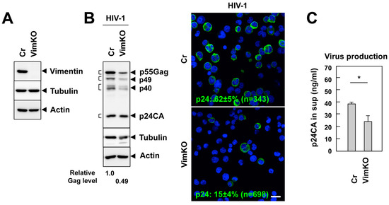Previous studies have shown that the actin cytoskeleton is dramatically rearranged to form a SMAC-like structure upon VS formation [2,11]. Our 2D DIGE analysis revealed an increase in vimentin in the DRM fractions upon cell contact (Figure 2), and the confocal analysis showed that vimentin accumulated at the contact sites of the infected and uninfected cells (37%) (Figure 4). In this study, we explored the role of vimentin in HIV-1 infection. To this end, the Jurkat cells were transduced with lentivirus-expressing Cas9 and gRNA-targeting vimentin (knockout), or Cas9 alone (control). Vimentin knockout was confirmed using Western blotting (Figure 5A). The cell phenotypes, including the doubling times, were not affected by the vimentin knockout, as described previously [42]. These Jurkat lineages were infected with HIV-1 at a high MOI for 2 days and analyzed using Western blotting. In the vimentin-deficient cells, the expression level of the Gag protein was lower than that of the control cells (Figure 5B, left). The immunofluorescence staining for p24CA confirmed these findings (Figure 5B, right). These results suggest that vimentin supports HIV-1 infection. In accordance, HIV-1 production, as monitored by a p24 capture ELISA, was lower in the vimentin-deficient cells than the control cells (Figure 5C).