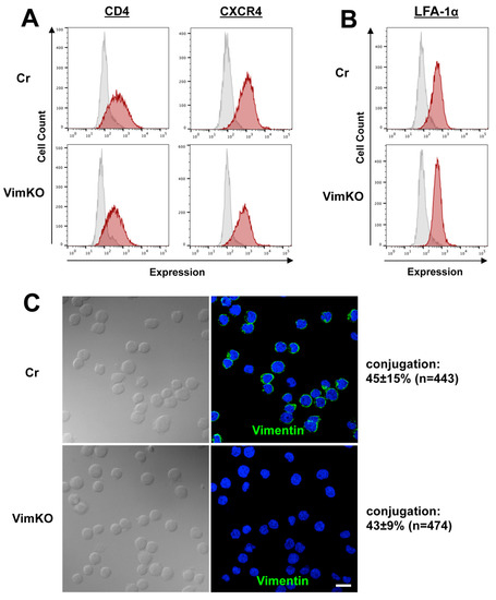 Recent studies have indicated that not only actin, but vimentin also play key roles in cell–cell contact by regulating the integrin function in endothelial and epithelial cells [43]. In endothelial cells, β1 and β3 integrin chains associate with vimentin to link the endothelial cells to the extracellular matrix [43,44,45]. In lymphocytes, LFA-1 (a heterodimer of αL and β2 chains) is a major surface molecule that regulates cell adhesion to form the immunological synapse and the VS [8,11,12]. It is possible that vimentin analogously contributes to the cell–cell contact in synapse-like structures through the LFA-1 β2 chain. We investigated the efficiency of this cell–cell contact in vimentin-deficient cells. The conjugation efficiency of the vimentin-deficient cells was equivalent to that of the control cells (Figure 6C). In accordance, the cell surface expression of LFA-1α, as monitored with FCM, was at similar levels in the vimentin-deficient and control cells (Figure 6B). These data suggest that vimentin is not responsible for cell–cell contact, at least in Jurkat cells.