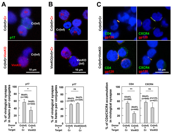 Formation of HIV-1 VS in vimentin-knockout Jurkat cells. (A) Formation of HIV-1 VS of vimentin-knockout donor cells. CRISPR control cells were infected with HIV-1 for 2 days. The cells were incubated with CMTMR-prelabeled, vimentin-knockout, or control cells on coverslips at 37 °C for 1 h, as described in the legend for Figure 1. The cell coculture samples were subjected to immunostaining with anti-HIV-1 p17MA antibodies specific to the mature p17MA but not to p55Gag. Cell nuclei were stained with DAPI. The CMTMR-positive and -negative cell conjugates were subjected to p17MA localization analysis. HIV-1 VS was defined as accumulation of HIV-1 antigens at the interface of cell conjugates. For quantification, the number of the cell conjugates with p17MA accumulation at the cell interface was counted and the percentages of the cell conjugates with the p17MA polarization in the total cell conjugates was calculated. (B) Formation of HIV-1 VS of vimentin-knockout acceptor cells. CRISPR control and vimentin-knockout cells were infected with HIV-1 for 2 days. The cells were incubated with CMTMR-prelabeled control cells at 37 °C for 1 h. The cell coculture samples were similarly subjected to immunostaining and confocal microscopy. (C) Accumulation of HIV-1 receptor/coreceptor in vimentin knockout cells. CRISPR control cells were infected with HIV-1 for 2 days. The cells were incubated with vimentin-knockout or control cells on coverslips in the presence of anti-CD4 and anti-CXCR4 antibodies at 37 °C for 1 h. After fixation of PFA, the cells were immunostained with anti-HIV-1 gp120 antibodies (without permeabilization). The accumulation efficiency of HIV-1 receptor/coreceptors at the cell–cell interface was shown as the percentages of CD4/CXCR4 at the cell interfaces in HIV-1-infected (defined as gp120-positive) and uninfected cell conjugates in the cell conjugates. Representative images (a z-slice image) were shown at the same magnification. Scale bar, 10 μm. The percentages are the mean ± SD from three independent experiments. ** p < 0.01; * p < 0.05; ns, not significant, Mann–Whitney U test. n indicates the numbers of the cell conjugates used for each analysis.