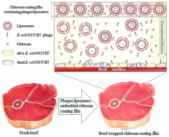 - Cui, H.; Yuan, L.; Lin, L. Novel chitosan fi lm embedded with liposome-encapsulated phage for biocontrol of Escherichia coli O157:H7 in beef. Carbohydr. Polym. 2017, 177, 156–164. [Google Scholar] [CrossRef]