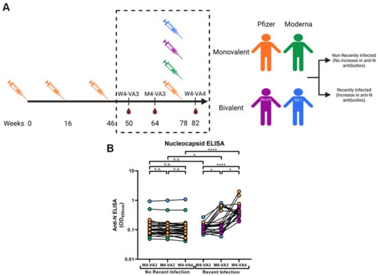 Cohort design and anti-N evaluation. (A) SARS-CoV-2 vaccine cohort timeline for administration of the vaccine doses and sampling. The syringes on the timeline represent the time of vaccine administration and blood drops represent the time of blood sampling. Individuals which had their fourth dose of vaccine being with Pfizer monovalent, Moderna monovalent, Pfizer bivalent and Moderna bivalent are represented by orange, green, purple and blue syringes, respectively. (B) Anti-N levels measured following the third and fourth dose of vaccine. This anti-N level was measured in the plasma of every individual donor at each timepoint available by ELISA. Donors were separated in non-recently infected individuals (n = 26) and recently infected individuals (n = 20) based on an increase in anti-N levels between W4-VA3 and M4-VA3 or between M4-VA3 and W4-VA4. Statistical significance within groups (paired t-test or Wilcoxon test) or between groups (unpaired t-test or Mann–Whitney test) was evaluated using the appropriate parametric or non-parametric statistical test based on the normal distribution of the data (n.s.: non-significant; *: p < 0.05; ****: p < 0.0001).