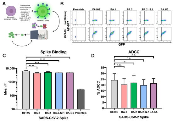 Characterization of the new cell lines expressing different SARS-CoV-2 Spikes. (A) Schematic representation depicting how the different cell lines were generated. The CEM.NKr CCR5+ parental cells were first transduced with a lentiviral vector coding for one of 5 different Spikes (D614G; BA.1; BA.2; BA.2.12.1; and BA.4/5) fused in their C-terminal with the GFP. The cells were then sorted and amplified multiple times. (B) Example of staining (or absence thereof) on the different cell lines by the CV3-25 monoclonal antibody at a concentration of 1 µg/mL. (C) Staining with the CV3-25 monoclonal antibody (n = 7) by gating on the GFP+ population (or the GFP- population for the parental cells). Mean FI: Mean Fluorescence Intensity. (D) ADCC on the different cell lines (n = 7) by the CV3-25 monoclonal antibody. Statistical significance was evaluated using the appropriate parametric or non-parametric statistical test (unpaired t-test or Mann–Whitney test) based on the normal distribution of the data (n.s.: non-significant; ***: p < 0.001; ****: p < 0.0001). The error bars represent the standard deviation (SD).