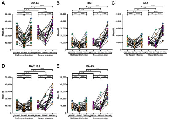 Spike recognition by plasma from vaccinated individuals presenting a history of recent infection or not. Staining with the plasmas of non-recently and recently infected individuals was measured four weeks following the third dose (W4-VA3), four months following the third dose (M4-VA3) and four weeks following the fourth dose (W4-VA4) on the cell lines expressing the (A) D614G, (B) BA.1, (C) BA.2, (D) BA.2.12.1 and (E) BA.4/5 Spikes by gating on the GFP+ population. Circles filled with orange, green, purple or blue represent data points of individuals who received a fourth dose of Pfizer monovalent, Moderna monovalent, Pfizer bivalent or Moderna bivalent vaccine, respectively. Statistical significance between groups (unpaired t-test or Mann–Whitney test) or within groups (paired t-test or Wilcoxon test) was evaluated using the appropriate parametric or non-parametric statistical test based on the normal distribution of the data (n.s.: non-significant; *: p < 0.05; **: p < 0.01; ****: p < 0.0001). Mean FI: Mean Fluorescence Intensity.
