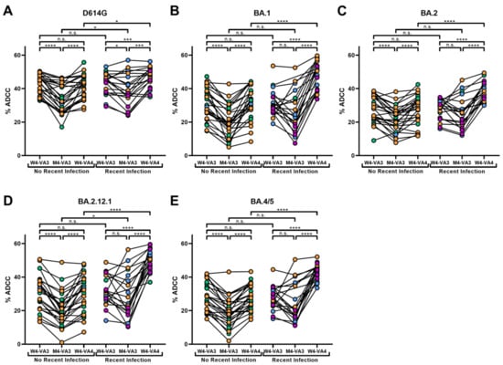 ADCC mediated by plasma from vaccinated individuals presenting a history of recent infection or not. ADCC with the plasmas of non-recently and recently infected individuals was measured four weeks following the third dose (W4-VA3), four months following the third dose (M4-VA3) and four weeks following the fourth dose (W4-VA4) on the cell lines expressing the (A) D614G, (B) BA.1, (C) BA.2, (D) BA.2.12.1 and (E) BA.4/5 Spikes. Circles filled with orange, green, purple or blue represent data points of individuals who received a fourth dose of Pfizer monovalent, Moderna monovalent, Pfizer bivalent or Moderna bivalent vaccine, respectively. Statistical significance between groups (unpaired t-test or Mann–Whitney test) or within groups (paired t-test or Wilcoxon test) was evaluated using the appropriate parametric or non-parametric statistical test based on the normal distribution of the data (n.s.: non-significant; *: p < 0.05; ***: p < 0.001; ****: p < 0.0001).