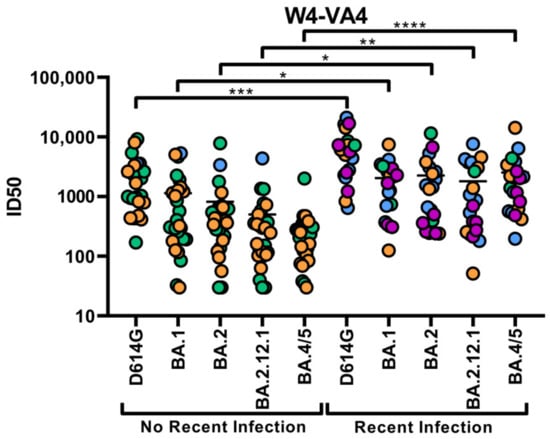 Since the neutralizing capacity of plasma from vaccinated/infected individuals was reported to be compromised against Omicron subvariants [13,14,15,16,18,19,20,21,22,23,24,25], we measured neutralization using pseudoviral particles bearing the different Spikes (Figure 5). Briefly, pseudoviruses bearing the different Spikes were produced in 293T cells. These pseudoviruses were incubated with several plasma dilutions for one hour at 37 °C. Following this, the pseudoviruses were incubated for 48 h on 293T-ACE2 target cells. The cells were then lysed and the neutralization half-maximal inhibitory dilutions (ID50) were calculated. While we observed that all Omicron subvariants were more resistant to neutralization than the D614G Spike in both groups, we also observed that recently infected individuals had significantly higher levels of neutralization against all pseudoviral particles (Figure 5). Overall, these results show that neutralization is more affected by changes in the Spike than ADCC (Supplemental Figure S2A,B).