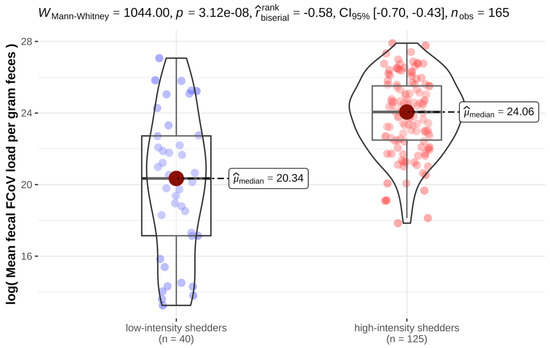 Violin plots depicting the significant correlation (p < 0.001) between mean feline coronavirus (FCoV) loads per gram (g) of feces (log of mean FCoV load) between low-intensity and high-intensity shedders. Three cats had to be excluded from the analysis because all of their RT-qPCR-positive samples yielded weak positive results, precluding analysis of fecal FCoV load.