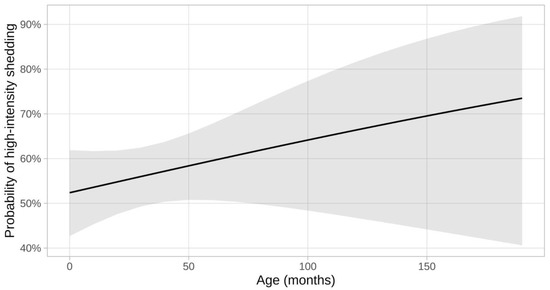 Probability of high-intensity shedding at different ages (in months). The grey shading indicates 95% confidence intervals. There was no significant association between age and high-intensity shedding in univariable analysis (p = 0.262) and, therefore, age did not become part of the multivariable model.