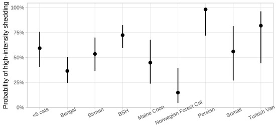 Probability of high-intensity shedding in the different breeds included in the study. Breeds were only depicted separately if at least 5 cats of the breed were included. Norwegian Forest Cats (p = 0.026, odds ratio (OR) 0.17, 95% confidence interval (CI) 0.04–0.82) had a lower risk; Persians had a higher risk of being a high-intensity shedder (p = 0.031, OR 28.98, 95%, CI 1.33–630.79). Dots represent the medians; bars represent 95% confidence intervals. Breeds represented by <5 cats were combined into one mixed group (<5 cats). BSH = British Shorthair.
