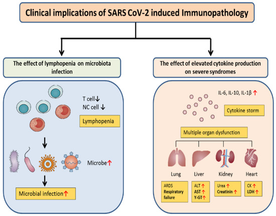 Clinical outcomes of SARS-CoV-2-related immunopathology. COVID-19 patients with lymphopenia are susceptible to infections with the microbe, which promotes disease progression and increased severity. Furthermore, cytokine storms can trigger inflammatory-associated multiple organ dysfunction, including lung injury that can result in ARDS, liver injury with ALT, AST, GGT elevation, kidney injury with increased BUN and creatinine levels, and heart injury with increased creatinine kinase (CK) and lactate dehydrogenase (LDH) levels.