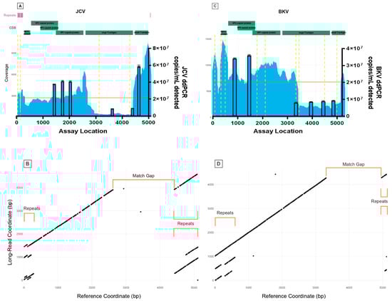 Overview of short- and long-read NGS analysis of JCV and BKV ISs (A). Absolute sequencing coverage across JCV reference genomes. Horizontal lines indicate mean coverage, dashed vertical lines indicate SNP positions (>1% minor allele frequency). The dPCR data depicted as blue bars in dPCR copies correspond with NGS coverage data. (B). Dot plot of JCV reference genomes (x-axis) plotted against one representative sub-read, generated via Nanopore sequencing (y-axis). Regions of no match and repetitive regions correlate with regions of low and high sequencing coverage. (C) and (D) show respective comparable analyses for BKV as a direct comparison with JCV for absolute sequence coverage and dot-plot analyses, respectively.