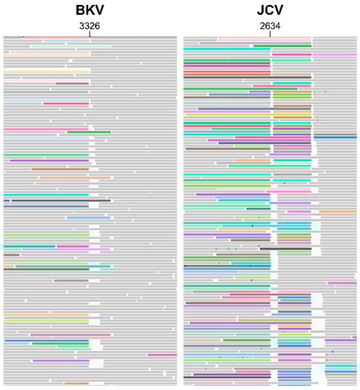 Firstly, we analysed the WHO ISs for BKV and JCV using amplicon-based Illumina deep sequencing. A total of 257,492 and 93,195 reads were aligned to BKV reference JN192431.1 and JCV reference J02226.1, respectively, detecting nine high-confidence (minor allele frequency > 1%) Single nucleotide polymorphisms (SNPs) for BKV and four for JCV (Table 2). For BKV, two mutations result in an amino acid change, and one results in a premature stop codon; for JCV, two mutations result in an amino acid change. For both viruses, read mappings displayed abrupt variations in sequencing depth (Figure 1A,C) with several locations of increased read-clipping (Figure 2) and junctional reads. Together, these observations suggest presence of viral subpopulations containing diverse structural variants (large-scale insertions, deletions, or other re-arrangements). Junctions for suspected structural variants were detected within BKV at the following positions: 203, 301, 610, 3326, 4966 and 5106; and within JCV at the following positions: 108, 128, 212, 297, 2493, 2634, 2693, 2945, 4423 and 4872.