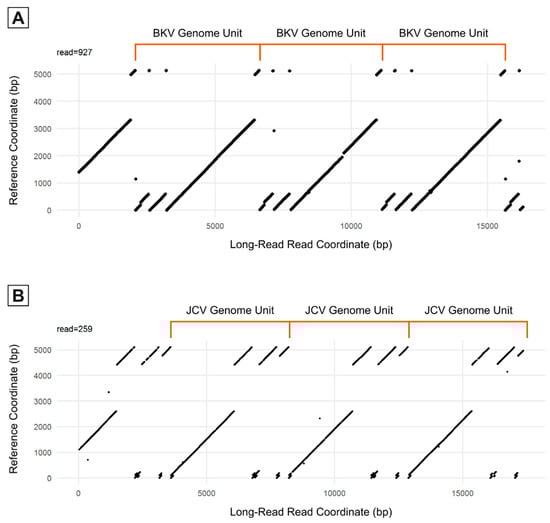 Representative Nanopore reads containing concatemeric copies of the full BKV IS and JCV IS genomes. Reference genomes (y-axis) of BKV (A) and JCV (B) are plotted against one representative Nanopore read (y-axis). Each read contains 3 full copies of BKV or JCV.