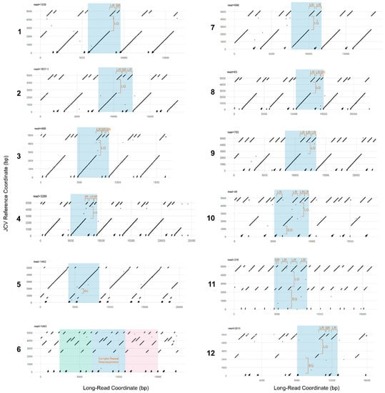 JCV structural variant quasi-species. JCV reference genomes (y-axis) are plotted against one representative Nanopore read (x-axis) belonging to a quasi-species with a specific set of genomic re-arrangements. Individual genomic units and characteristic match gaps and repeats are highlighted. Reads have been assigned to groups of quasi-species based on the similarity of the dot plot. Estimated frequencies of identified quasi-species: (1) 1.0%, (2) 5.1%, (3) 1.0%, (4) 1.0%, (5) 8.2%, (6) 1.0%, (7) 15.3%, (8) 31.6 %, (9) 1.0%, (10) 1.0%, (11) 32.7%, (12) 1.0%. LR: long repeat; SR: short repeat; LG: late gap; EG: early gap.