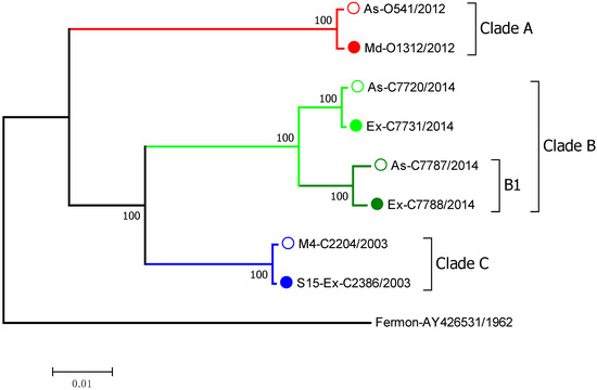 The phylogenetic tree of EV-D68 clinical isolates selected for cloning. Full-length genome sequences were analyzed. The numbers next to each tree branch represent bootstrap values showing the percentage of replicate trees that the viral strain clustered together. The branch lengths represent the evolutionary distance in units of base pair differences per viral sequence, with the scale bar denoting difference. Severity of symptoms designations: As—asymptomatic; Ex—exacerbation; M—mild; S—severe; numbers following the designations indicate symptom score where available. Filled and empty circles of the same color show symptomatic and asymptomatic infections, respectively.