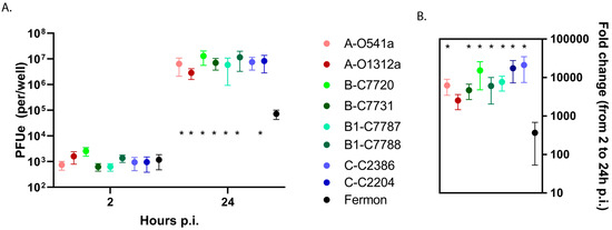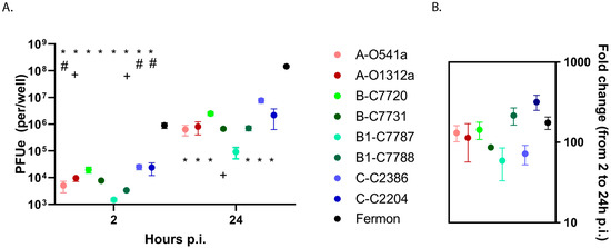 Viral binding and replication in HeLa cells. (A) Cell-associated input virus (2 h p.i.) and progeny yields (24 h p.i.) were determined by RT-qPCR and (B) viral replication was calculated and compared for each isolate. The first letters in isolate designations represent the phylogenetic clade, and the following letters and numbers indicate the clinical isolate ID. The * represents a difference (p < 0.05) in the clinical isolates vs. Fermon, + represents a difference (p < 0.05) in isolate 7787 vs. other isolates, and # represents a difference (p < 0.05) in isolates C2386, C2204, and C7720 vs. other isolates. Data are means and SEM from five independent experiments. The viruses are color-coded according to clade, with darker color indicating severe illness and lighter color indicating asymptomatic infection.