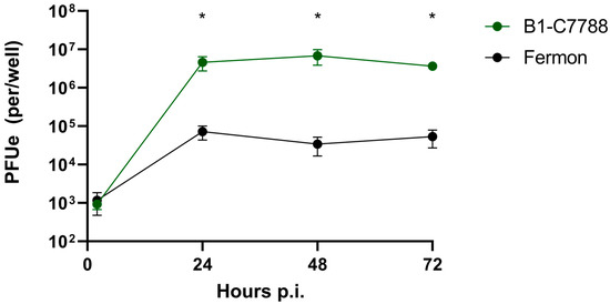 Time course of infection with isolate C7788 and Fermon in differentiated human primary BEC-ALI cultures. The * represents difference (p < 0.05) between Fermon and B1-7788 isolate. Data are means and SEM from five independent experiments.