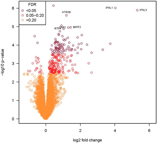 RNA-seq volcano plot identifying differentially expressed genes in BEC-ALI cultures after infection with recent EV-D68 isolates vs. Fermon. The x-axis represents the log2 values of the fold change observed for each mRNA transcript, and the y-axis represents the log10 of the p-values of the significance tests between replicates for each transcript. The orange circles represent genes that had an FDR of >0.2, circles in red are genes with an FDR between 0.05–0.2, and the circles in burgundy are genes with an FDR of <0.05. The labeled genes (n = 6) had an FDR of <0.03 and a fold change >2.