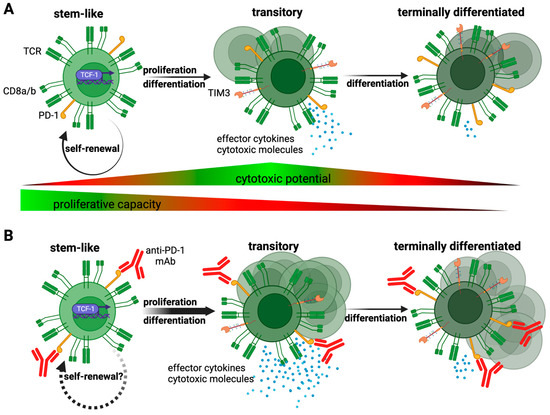 - Hudson, W.H.; Gensheimer, J.; Hashimoto, M.; Wieland, A.; Valanparambil, R.M.; Li, P.; Lin, J.-X.; Konieczny, B.T.; Im, S.J.; Freeman, G.J.; et al. Proliferating Transitory T Cells with an Effector-like Transcriptional Signature Emerge from PD-1+ Stem-like CD8+ T Cells during Chronic Infection. Immunity 2019, 51, 1043–1058.e4. [Google Scholar] [CrossRef]