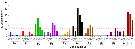 | SARS-CoV-2 Antiviral Activity (10–20% Viral Inhibition) | Presence/Absence of 298.33 Da (Bi121.2) Small Molecule Using MS | |