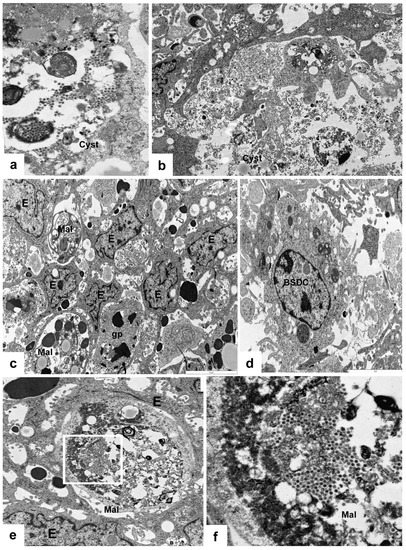 - Felföldi, B.; Bódi, I.; Minkó, K.; Benyeda, Z.; Nagy, N.; Magyar, A.; Oláh, I. Infection of bursal disease virus abrogates the extracellular glycoprotein in the follicular medulla. Poult. Sci. 2021, 100, 101000. [Google Scholar] [CrossRef] [PubMed]