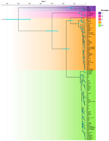 Recently, the epidemiology of JEV is changing, and it has been expanding from Asia to other regions of the world such as Papua New Guinea and Australia. The rest of the world, such as Europe, South and North America, and Pacific Islands, are also receptive due to the presence of JEV-competent mosquito vectors. To determine the continuously evolving situation of JEV, we downloaded the available complete genome sequences (n = 160) and constructed phylogeny and population dynamics to report the possible threat of JE disease. We constructed a Bayesian molecular timeline phylogenetic tree to investigate the most recent common ancestor (tMRCA) for all genotypes. Figure 1 explained that the tMRCA occurred about 2993 years ago (YA) (95% Highest posterior density (HPD), 2433 to 3569). The branching of the lineages occurred in the following order: genotype V, at the root of the tree; genotype IV, about 1492 YA (95% HPD, 1221 to 1776); genotype I, II, and III shared their MRCA about 861 YA (95% HPD, 709 to 1018); MRCA of genotype I and II was about 675 YA (95% HPD, 556 to 802). The mean rate of nucleotide substitution for all available (till December 2022) JEV strains isolated from a variety of hosts worldwide, estimated using a Bayesian MCMC approach, was 1.0628 × 10−4 nucleotide substitutions per site per year (95% HPD values 8.7795 × 10−5, 1.2564 × 10−4).