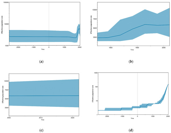 Bayesian skyline plots representing the demographic history of JEV. The central solid blue line represents the median posterior value, and the shaded area represents the 95% HPD intervals. The x-axis corresponds to time (years), while the y-axis represents the effective population size. (a) Population modeling during the whole evolutionary history; (b) Population trends during the period 1750–2022; (c) Population dynamics from 2000 to 2022; (d) JEV lineage through time.