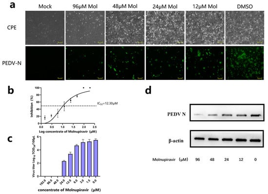 Effects of molnupiravir on PEDV proliferation. Cells from the Vero lineage were subjected to PEDV virus at an MOI of 0.1 and incubated for 1 h at 37 °C. Next, varying concentrations of molnupiravir were introduced. (a) Antiviral activity of molnupiravir against PEDV was assessed through CPE observation and IFA. Mol, molnupiravir (scale bar: 100 μm). (b) Dose–response analysis of molnupiravir in Vero cells. Inhibition rates were calculated by relative quantification of PEDV N protein mRNA. (c) Following the administration of molnupiravir, the titers of virus present in the supernatant exhibited a noticeable decrease, which was contingent upon the dose used. (d) Western blot identification in Vero cells. The PEDV-N-protein expression was influenced by molnupiravir. Mol, molnupiravir.
