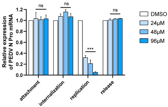 Influence of molnupiravir on PEDV attachment, internalization, replication, and release. Synthesized PEDV N Pro mRNA levels were assessed by RT-qPCR. Asterisk (*) indicates a significant difference among them (*** p < 0.001). The “ns” is used to indicate lack of statistical significance.