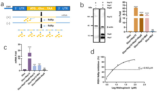 We developed a cell-based PEDV-RdRp-Gluc reporter system to evaluate the impact of molnupiravir on PEDV RdRp. The reporter vector was created by building a Gluc gene placed between the 5′ and 3′ untranslated regions (UTRs) of the PEDV, as illustrated in Figure 3a. The RdRp has a certain template specificity, which is mainly manifested in the UTR sequence of the template and the secondary structure it forms [15]. Gluc transcription is initiated by the cytomegalovirus (CMV) promoter, which increases Gluc-mRNA and Gluc-protein levels through RdRp expression. The amplified Gluc activity on the luminescence test suggested PEDV RdRp activity. Following the transfection of the reporter vector and pCAGGS-Nsp12, there was a 60-fold elevation in Gluc activity within the cells compared to the cells transfected with the control reporter vector. The reporter-plasmid-to-RdRp-vector ratio was maintained at 1:10 to ensure low background values. As reported previously, SARS-CoV-2’s Nsp7 and Nsp8 are subunits of the RdRp holoenzyme. Consequently, Nsp7 and Nsp8 were also transfected into the PEDV-Gluc-reporter-expressing cells with Nsp12. Surprisingly, the presence of Nsp7 and Nsp8 led to an increase in Gluc activity, albeit lower than that of the PEDV-Gluc-reporter-expressing cells transfected with Nsp12 alone. The increase in Gluc activity in the presence of RdRp was also supported by the RT-qPCR results (Figure 3c). The PEDV-RdRp-Gluc reporter system without Nsp7 or Nsp8 was selected as a result. In order to verify the specificity of the system aimed at the detection of PEDV, the Nsp9 protein sourced from the porcine reproductive and respiratory syndrome virus (PRRSV) was employed as a negative control. The Nsp9 protein possesses RdRp enzyme activity but is not related to PEDV [16]. The Nsp9 protein of the PRRSV did not increase the Gluc translation level (Figure 3c and Figure S3). Based on these data, we reached the conclusion that the PEDV RdRp was able to enhance the Gluc activity.