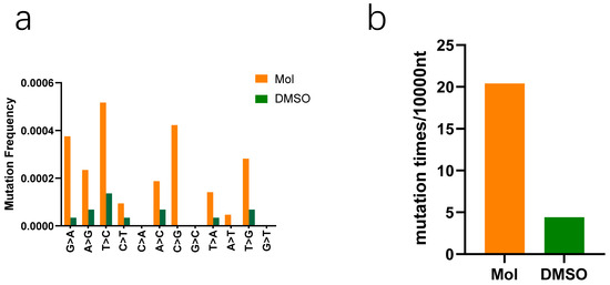 Molnupiravir increases mutation rates in PEDV gRNA. (a) The occurrence rate of all mutation types in both groups. (b) Mutation rates were calculated by sequencing results. Mol, molnupiravir.